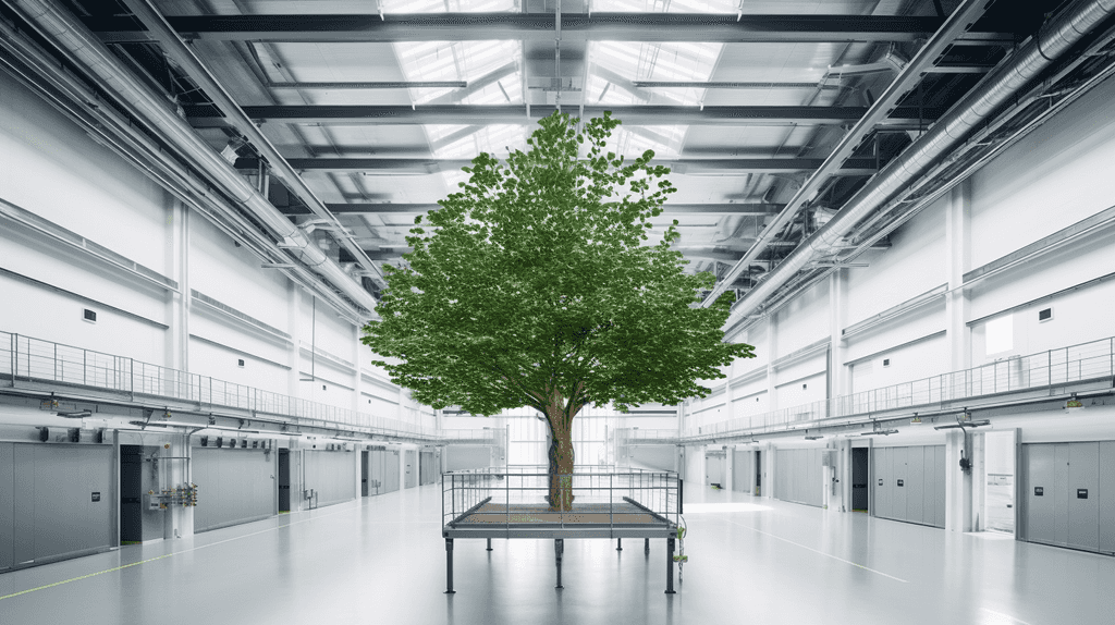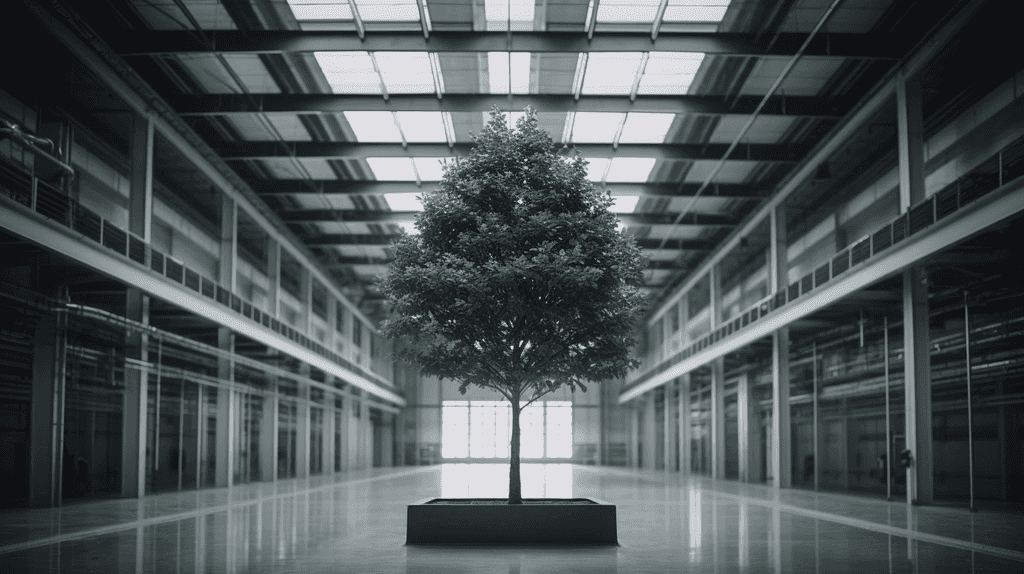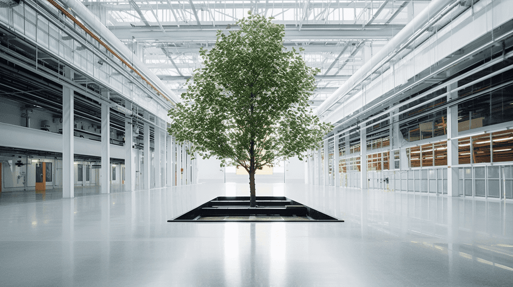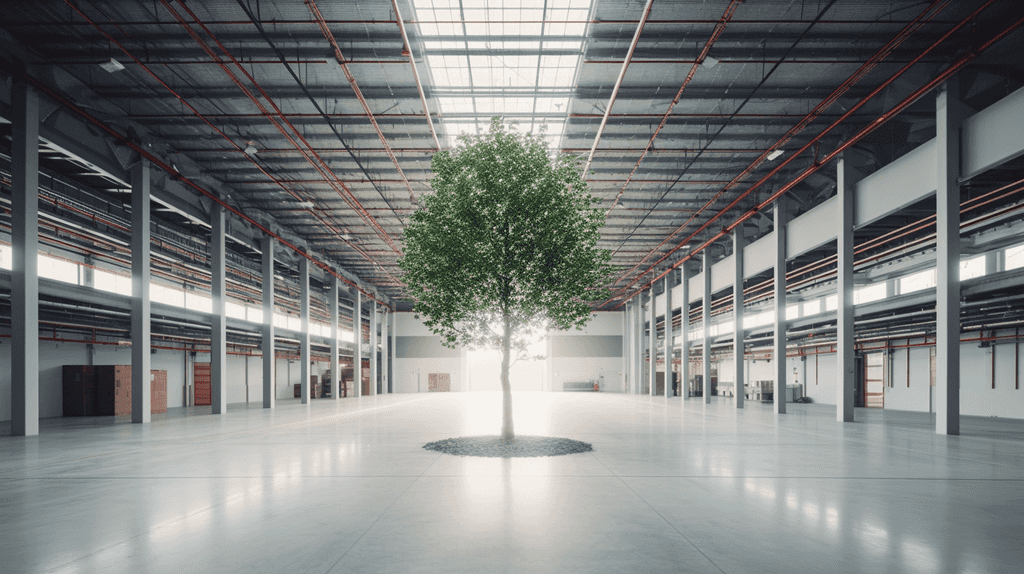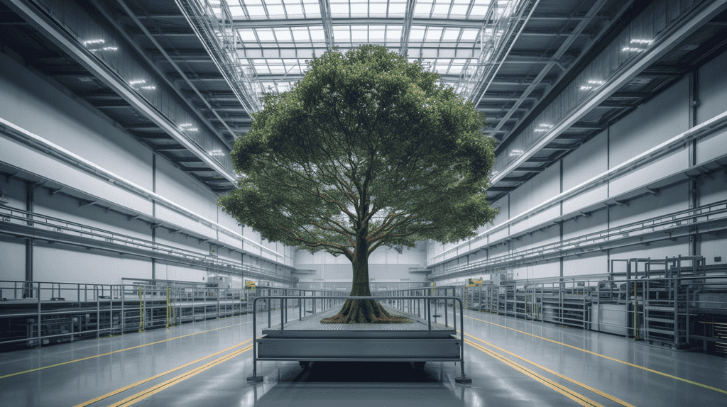 Accentuate the positive impact of Fieldnode's digital inventory solutions on the environment and supply chain efficiency by incorporating images of pristine, well-organized manufacturing facilities, localized production of spare parts, and minimized waste.