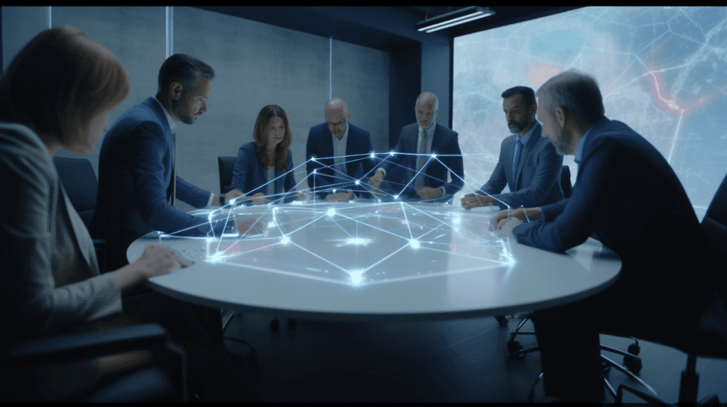 Capture the essence of Fieldnode's collaborative platform with images that showcase diverse teams working in unison, professionals engaging in constructive conversations, and global supplier networks.